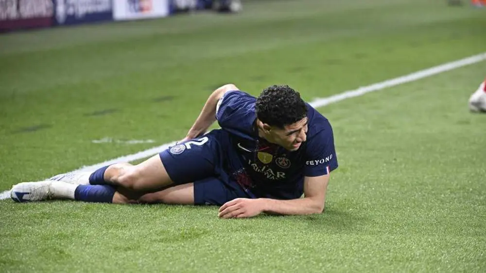 El lateral marroquí se dañó en la parte trasera del muslo derecho en los últimos minutos (88′) de la espectacular ida de semifinales de la Champions, en la que el PSG ganó 5-4 al Bayern Múnich el martes en París.